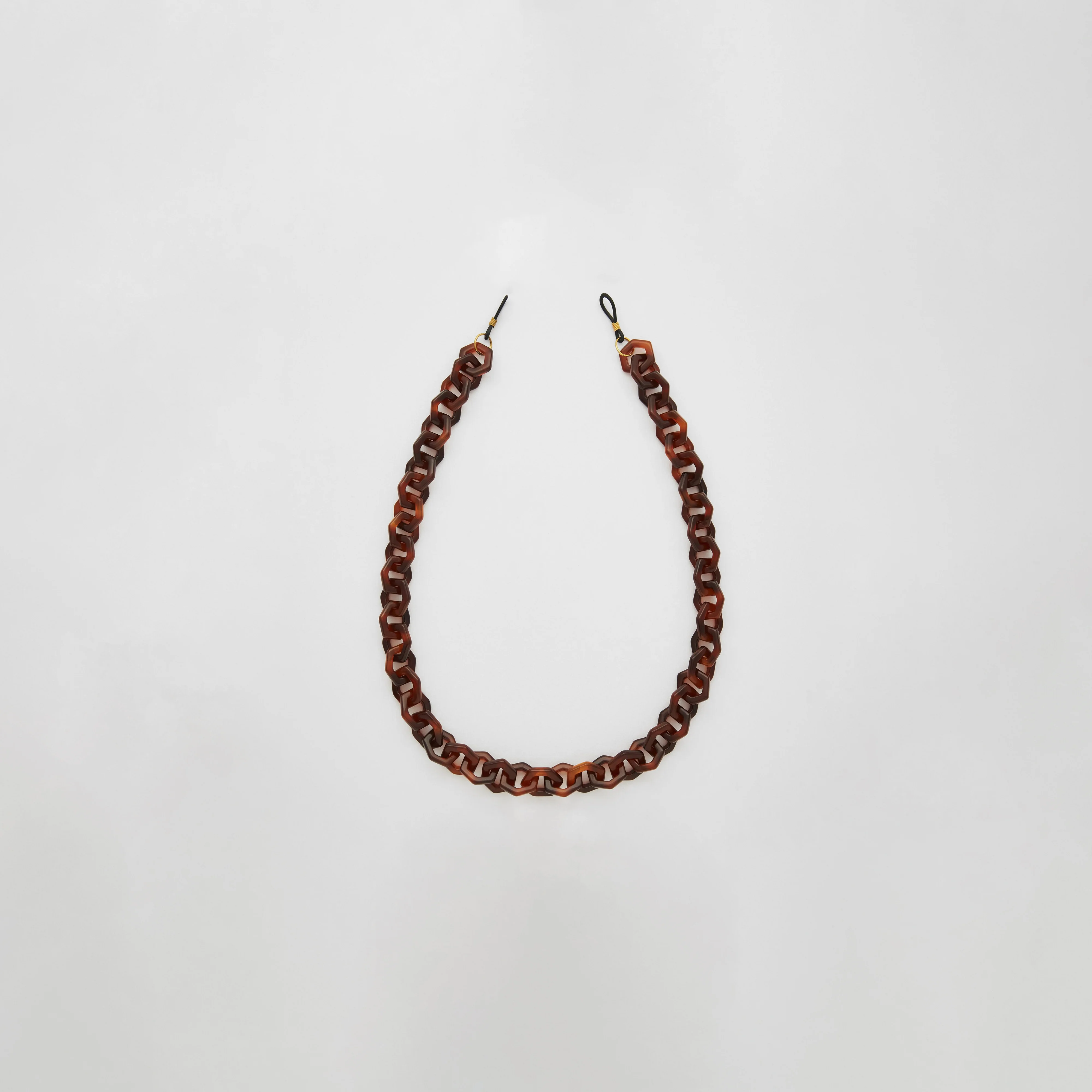 Spectacle chains made from the waste acetate material leftover from the spectacle making process. Each piece of ‘swarf’ Italian cellulose acetate is cut to a series of hexagonal loops, and is individually milled and linked by hand.